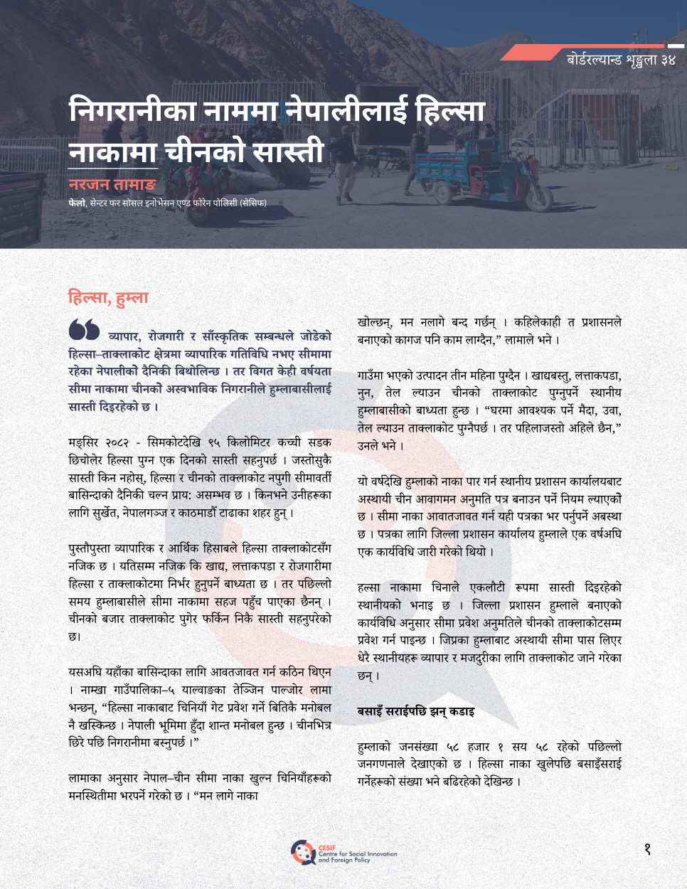हुम्लाको हिल्सा नाका वर्षौंदेखि स्थानीयको रोजगारी, व्यापार र दैनिक जीवनको मुख्य आधार बनेको छ। सिमकोटदेखि ९५ किलोमिटर दुर्गम सडक पार गरी चीनको ताक्लाकोट पुग्नुपर्ने हुम्लाबासीहरू खाद्यान्न, लत्ताकपडा र आवश्यक सामग्रीका लागि यही नाकामा निर्भर छन्। तर पछिल्ला वर्षहरूमा चीनले एकतर्फी रूपमा कडाइ बढाएपछि स्थानीयले अस्वभाविक सास्ती भोग्नुपरेको छ।